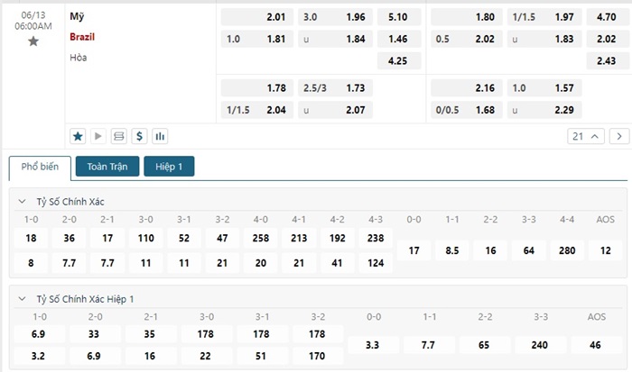 Bảng tỷ lệ kèo bóng đá trận đấu Mỹ vs Brazil