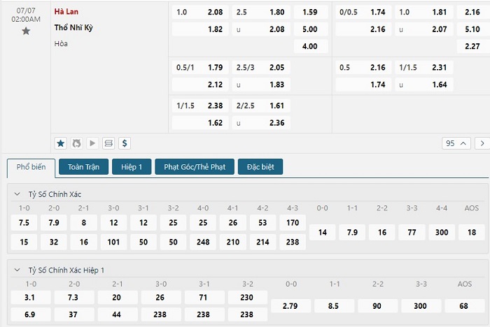 Bảng tỷ lệ kèo bóng đá trận đấu Hà Lan vs Thổ Nhĩ Kỳ