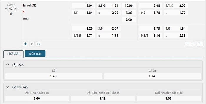 Bảng tỷ lệ kèo bóng đá trận đấu Israel vs Italia