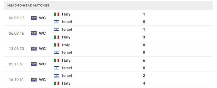 Quá khứ gần như đang đứng hoàn toàn về phía Italia trong những lần gặp nhau của hai đội, thật vậy bởi tại 5 lần gặp nhau gần đây Israel còn chưa biết tới mùi thắng lợi trước đối thủ này, thành tích tốt nhất mà Israel có được chỉ là 1 trận hoà trong khi có tới 4 thất bại theo mốc kèo châu Âu của trận đấu, do đó mà với thực lực hiện tại việc Italia tiếp tục có được một chiến thắng theo mốc kèo châu Âu cũng là điều không phải quá khó khăn với họ.
