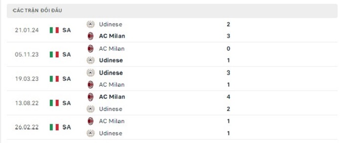 Lịch sử đối đầu của AC Milan vs Udinese