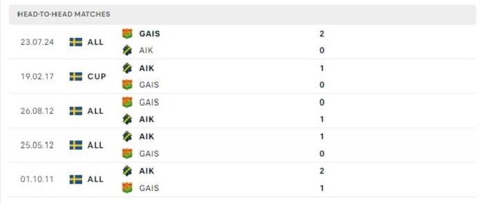 Lịch sử đối đầu của AIK Solna vs GAIS Goteborg