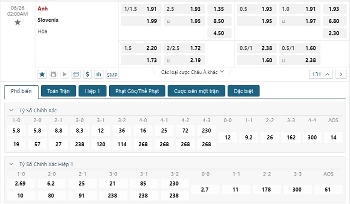 Bảng tỷ lệ kèo bóng đá trận đấu Anh vs Slovenia