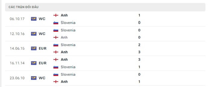 Lịch sử đối đầu của Anh vs Slovenia