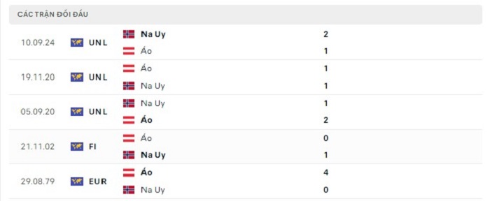 Lịch sử đối đầu của Áo vs Na Uy
