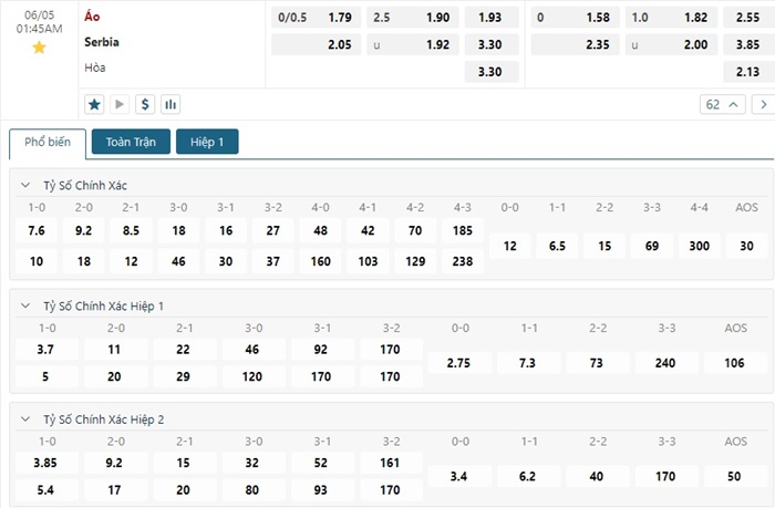 Bảng tỷ lệ kèo bóng đá trận đấu Áo vs Serbia