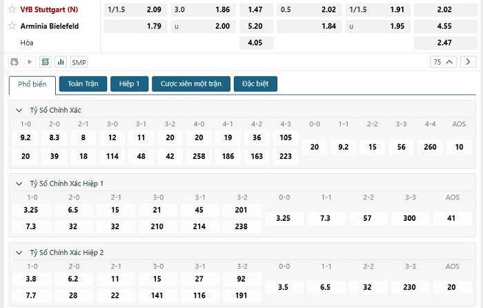 Bảng tỷ lệ kèo bóng đá trận đấu Arminia Bielefeld vs Stuttgart