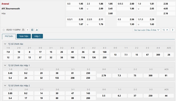 Bảng tỷ lệ kèo bóng đá trận đấu Arsenal vs Bournemouth
