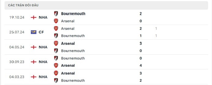 Lịch sử đối đầu của Arsenal vs Bournemouth