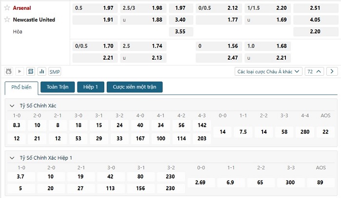Bảng tỷ lệ kèo bóng đá trận đấu Arsenal vs Newcastle
