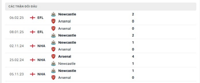 Phong độ gần đây Arsenal vs Newcastle