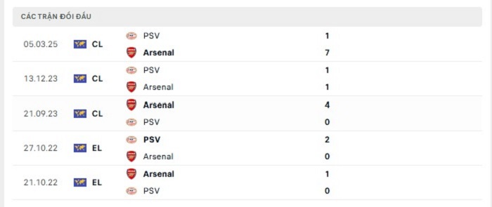 Lịch sử đối đầu của Arsenal vs PSV Eindhoven