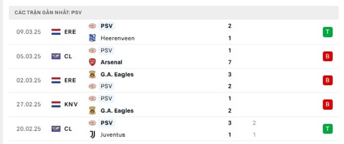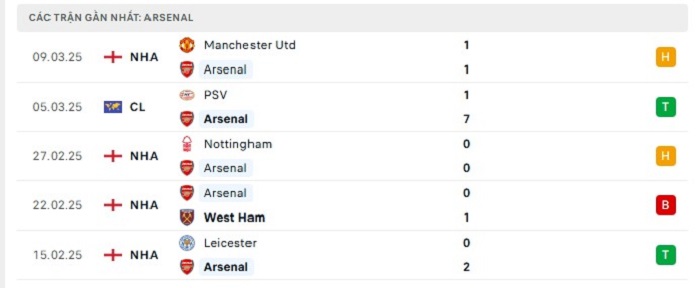 Phong độ gần đây Arsenal vs PSV Eindhoven