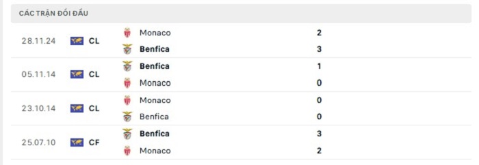 Lịch sử đối đầu của AS Monaco vs Benfica