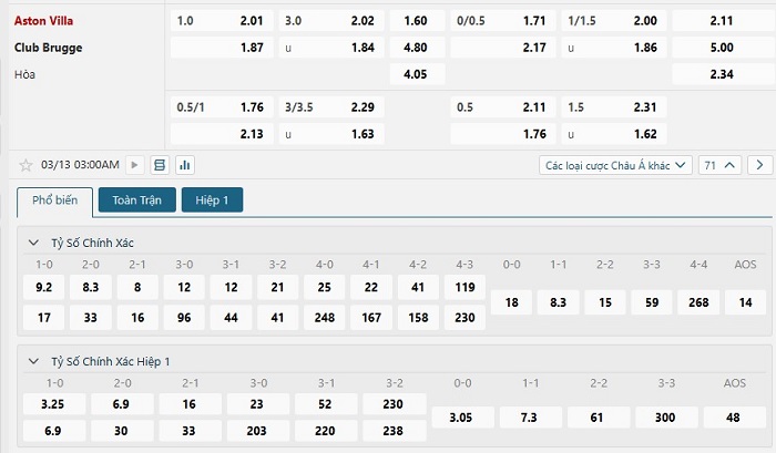 Soi kèo tỷ số Aston Villa vs Club Brugge