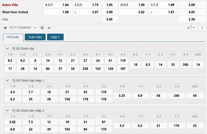 Ở thời điểm hiện tại Aston Villa là cái tên được sự đánh giá cao từ giới chuyên môn so với West Ham, điều này đang được nhận thấy thông qua mốc kèo châu Á được niêm yết hiện tại. Thực tế với Aston Villa phong độ trên sân nhà của họ ở mùa giải chính là điểm mạnh của họ khi mới chỉ để thua duy nhất 1 vòng đấu ở sân chơi Ngoại hạng Anh, xét về mặt phong độ mà nói với Aston Villa họ cũng tốt hơn nhiều so với đội bóng thành phố London ở mùa giải hiện tại, do vậy mà có thể đặt niềm tin vào đội chủ nhà ở lần gặp nhau sắp tới.
