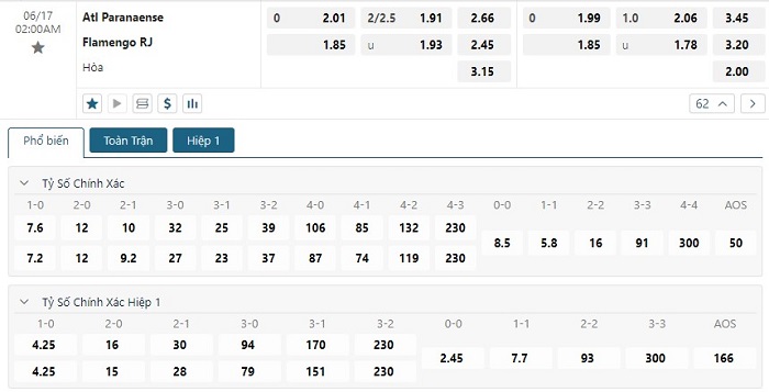 Bảng tỷ lệ kèo bóng đá trận đấu Atl Paranaense vs Flamengo