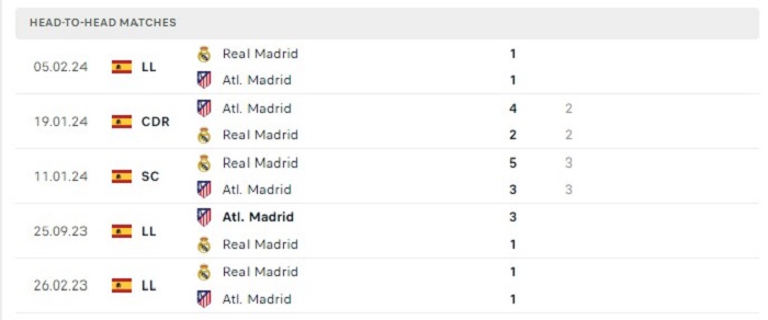 Bảng bóng đá trận đấu Atletico Madrid vs Real Madrid