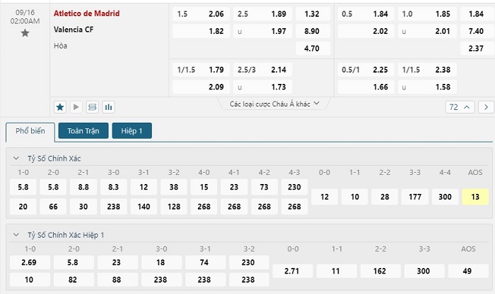Soi kèo châu Á, kèo chấp Atletico Madrid vs Valencia
