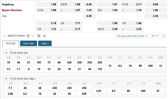 Bảng tỷ lệ kèo bóng đá trận đấu Augsburg vs Bayern Munich