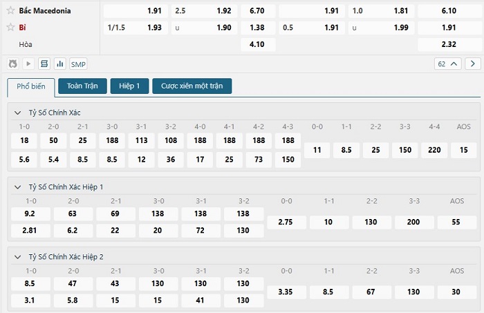 Bảng tỷ lệ kèo bóng đá trận đấu Bắc Macedonia vs Bỉ