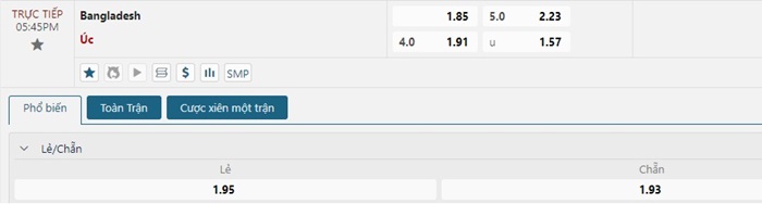 Bảng tỷ lệ kèo bóng đá trận đấu Bangladesh vs Úc