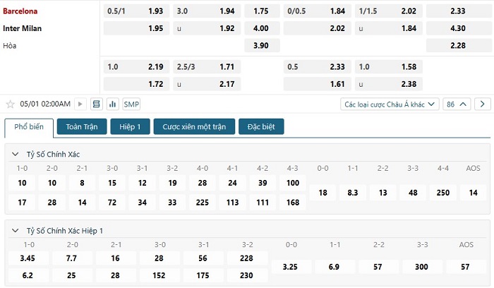 Bảng tỷ lệ kèo bóng đá trận đấu Barcelona vs Inter Milan