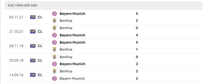 Bảng bóng đá trận đấu Bayern Munich vs Benfica