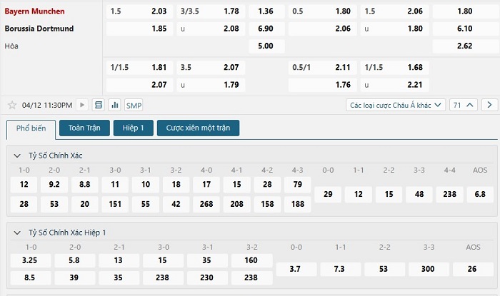Bảng tỷ lệ kèo bóng đá trận đấu Bayern Munich vs Borussia Dortmund