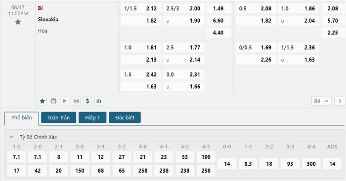 Bảng tỷ lệ kèo bóng đá trận đấu Bỉ vs Slovakia
