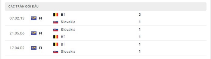 Lịch sử đối đầu của Bỉ vs Slovakia