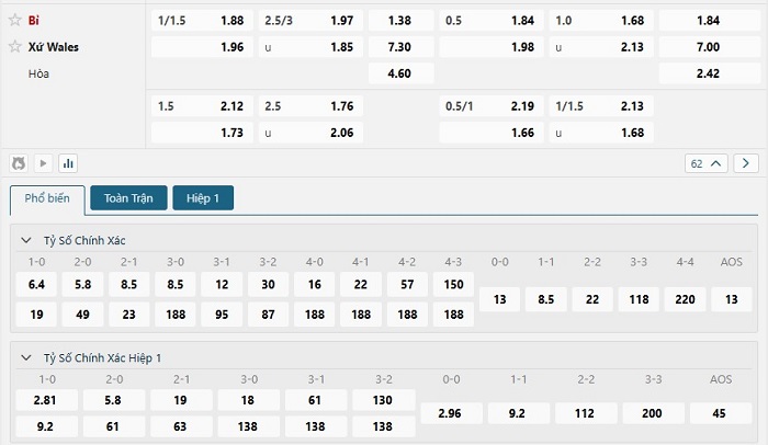 Bảng tỷ lệ kèo bóng đá trận đấu Bỉ vs Wales