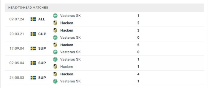 Lịch sử đối đầu của BK Hacken vs Vasteras