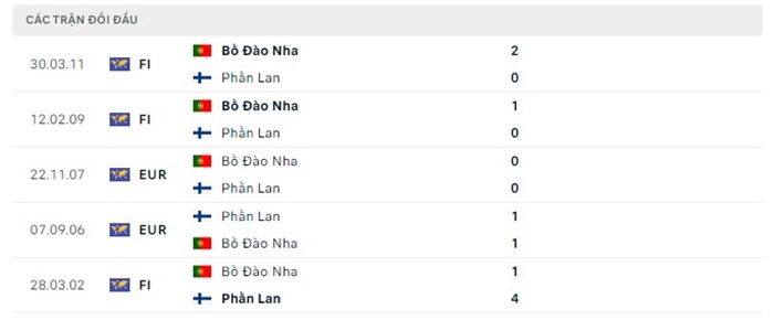Lịch sử đối đầu của Bồ Đào Nha vs Phần Lan