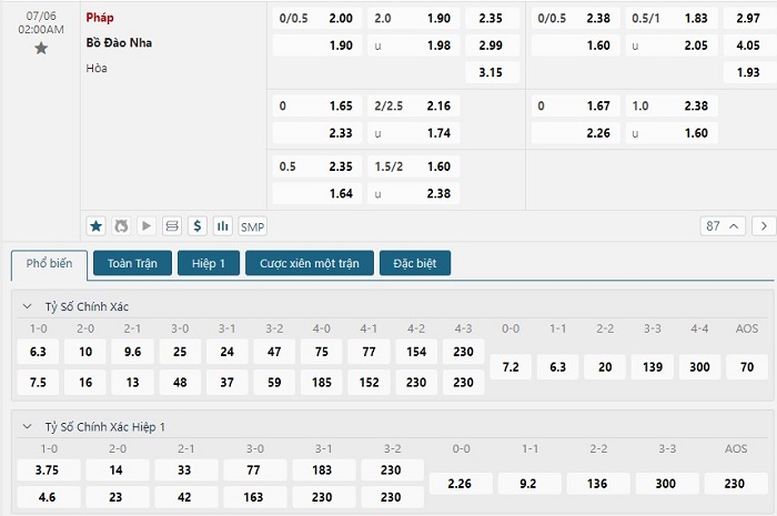 Bảng tỷ lệ kèo bóng đá trận đấu Bồ Đào Nha vs Pháp
