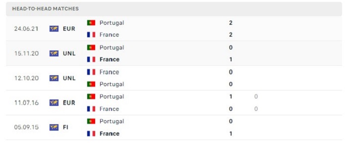 Cả 2 chiến thắng của Pháp trước Bồ Đào Nha trong quá khứ đều là những chiến thắng tối thiểu 1-0 chung cuộc, trong 5 lần gặp nhau gần nhất chỉ duy nhất 1 lần tỷ số trận đấu ghi được nhiều trong trận, điều này cũng đã phản ánh về sự thận trọng và chắc chắn trong lối chơi của cả hai đội thời điểm này. Chính vì vậy mà tỷ số trận đấu sắp tới cũng vì vậy mà khó có thể xuất hiện nhiều trong trận.