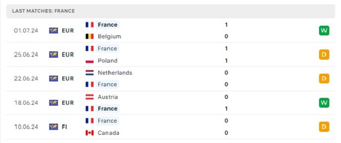 Quá khứ đứng về phía đội tuyển Pháp trong những lần gặp nhau của hai đội, trong 5 lần gặp nhau gần đây trước Bồ Đào Nha tuyển Pháp có được thành tích bất bại với 3 trận hoà cùng với đó là 2 trận thắng. Tại vòng chung kết Euro 2024 này đội tuyển Pháp cũng chưa từng để thua theo kèo châu Âu cả trận cũng có thể thấy được bộ mặt thi đấu đầy lì lợm của họ. Do đó mà khả năng vượt qua mốc kèo châu Âu của Pháp vẫn được kỳ vọng nhiều hơn.