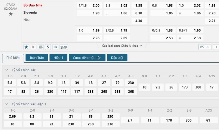 Bảng tỷ lệ kèo bóng đá trận đấu Bồ Đào Nha vs Slovenia