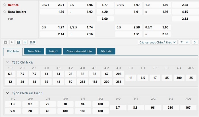 Bảng tỷ lệ kèo bóng đá trận đấu Boca Juniors vs Benfica