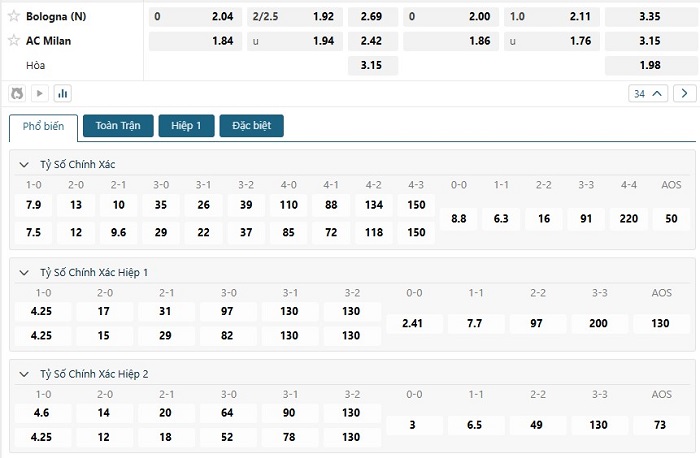 Bảng tỷ lệ kèo bóng đá trận đấu Bologna vs AC Milan