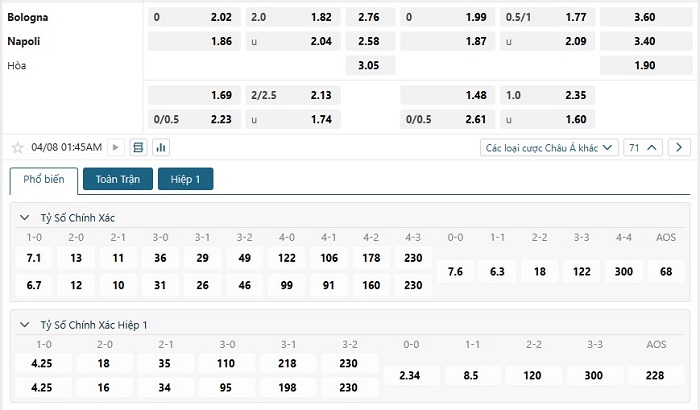 Bảng tỷ lệ kèo bóng đá trận đấu Bologna vs Napoli
