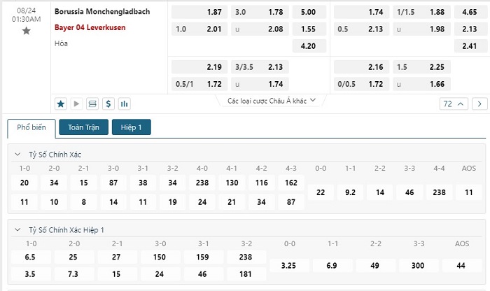 Bảng tỷ lệ kèo bóng đá trận đấu Borussia Monchengladbach vs Bayer  Leverkusen
