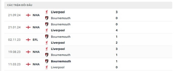 Bảng bóng đá trận đấu Bournemouth vs Liverpool