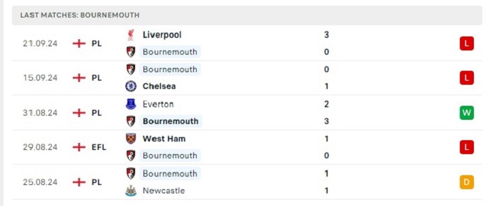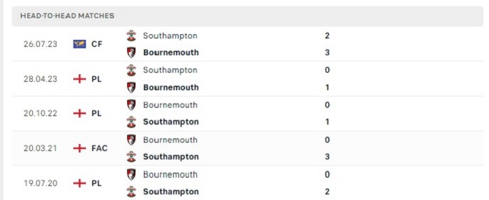Bảng bóng đá trận đấu Bournemouth vs Southampton