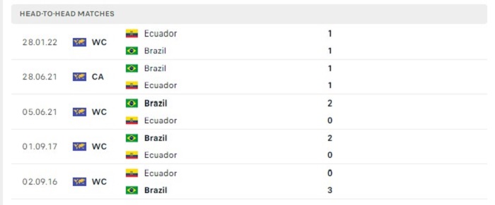 Những lần gặp nhau giữa Brazil và Ecuador trong quá khứ vốn cũng không có quá nhiều bàn thắng ghi được, cụ thể là 5 trận gặp nhau liên tiếp của hai đội trên sân nhà của Brazil gần đây cũng chỉ có được từ 2 bàn thắng ghi được trở xuống. Ecuador cũng chỉ ghi được vỏn vẹn 1 bàn thắng trong 5 lần làm khách trên sân của Brazil trước đây, bởi vậy mà tỷ số của trận đấu sắp tới của hai đội cũng sẽ khó có thể xuất hiện nhiều trong trận.