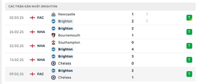 Phong độ gần đây Brighton vs Fulham