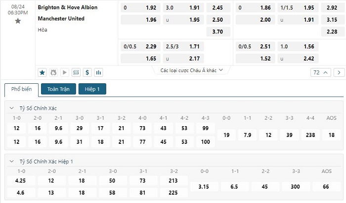 Bảng tỷ lệ kèo bóng đá trận đấu Brighton vs Manchester United