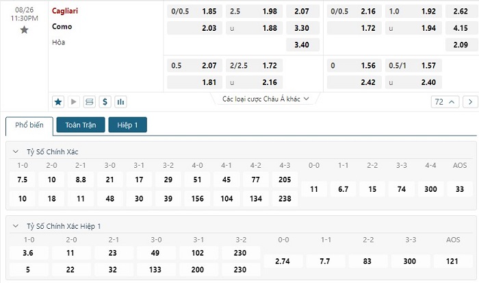 Bảng tỷ lệ kèo bóng đá trận đấu Cagliari vs Como