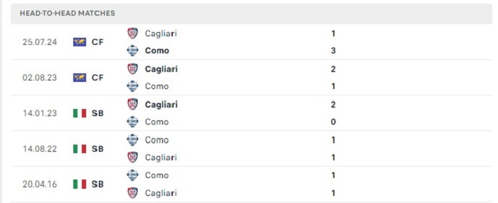 Quá khứ cũng đang gần như hoàn toàn đứng về phía Cagliari trong những lần gặp nhau giữa hai đội, cụ thể là Cagliari có được 4 chiến thắng và 3 trận hoà trong khi chỉ thua 1 trận đấu theo mốc kèo châu Âu trước Como trước đây. Thất bại duy nhất mà Cagliari phải nhận thì là một trận đấu giao hữu hè vừa qua và tính chất của trận đấu là không mấy quan trọng với họ. Do đó mà với khả năng hiện tại của mình việc Como có thể tạo nên được bất ngờ trước Cagliari theo kèo châu Âu của trận đấu cũng là nhiệm vụ được xem là khó khăn với họ.
