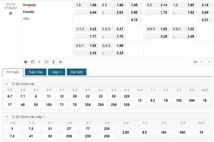 Bảng tỷ lệ kèo bóng đá trận đấu Canada vs Uruguay